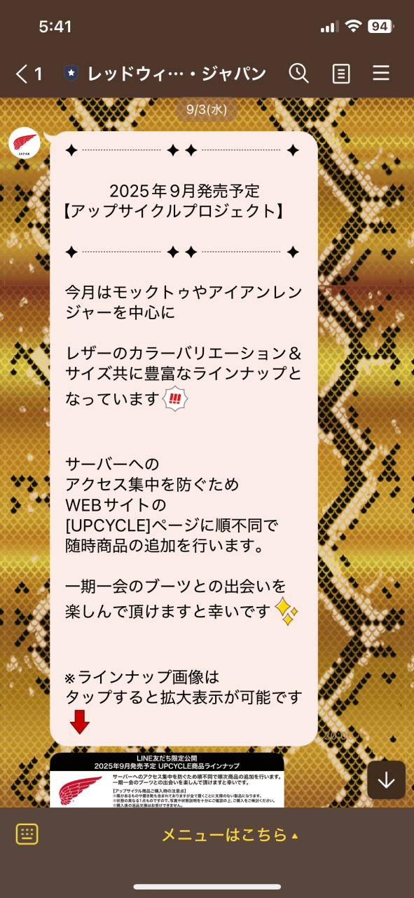 レッドウィングの公式LINEアカウントをお友だち登録すると、アップサイクルプロジェクトの新ラインナップ情報をいち早く受け取ることができます。